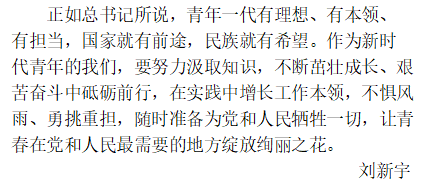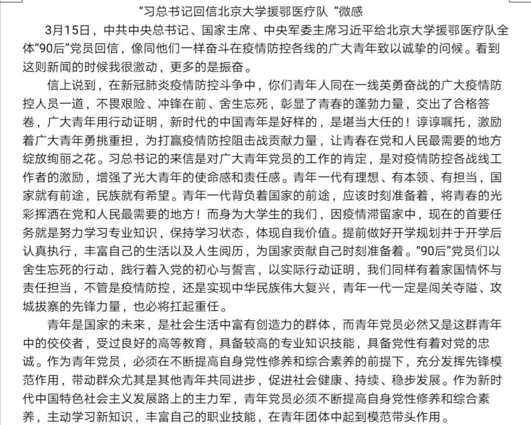 四虎 学生党员围绕“习近平总书记回信”心得体会 作者:李孟帆 来源:四虎 发布时间:2020-07-07 阅读次数: 中共中央总书记、国家主席、中央军委主席习近平3月15日给北大学生援鄂医疗队全体“90后”党员回信,向他们和奋斗在疫情防控各条战线上的广大青年致以诚挚的问候。四虎 17级党员、预备党员,19级各班团支部积极响应号召,感受颇深,执笔写下内心的真实体会。 (审核人:相萌萌)