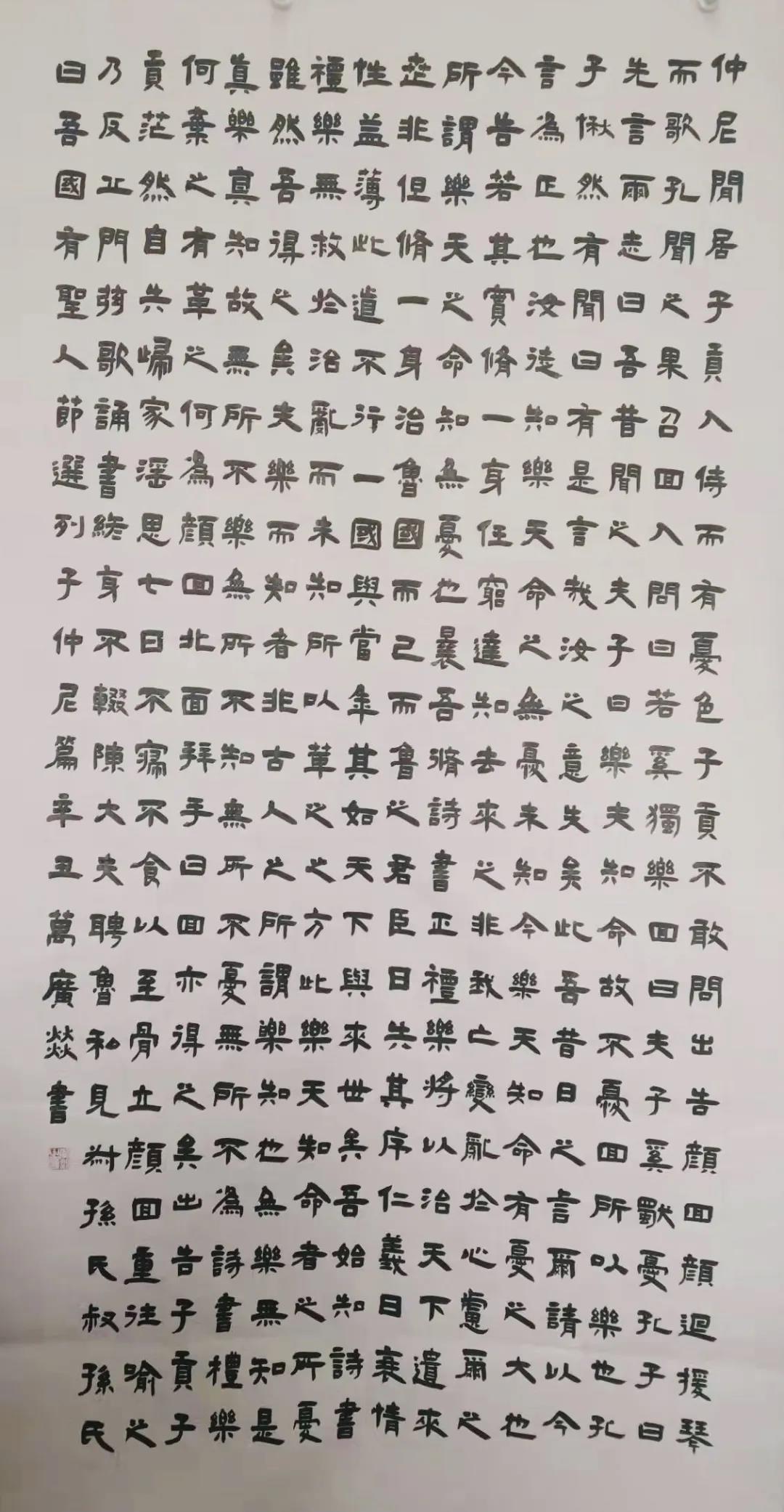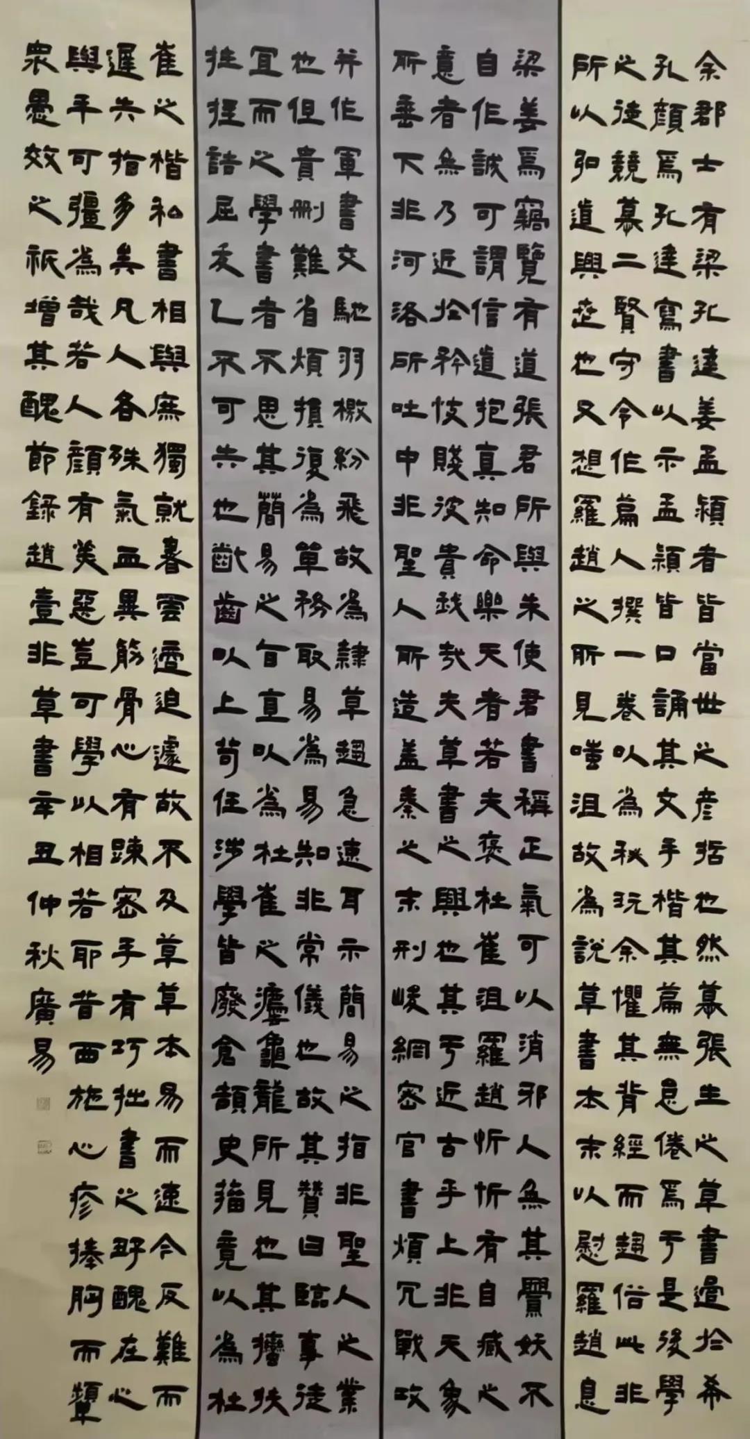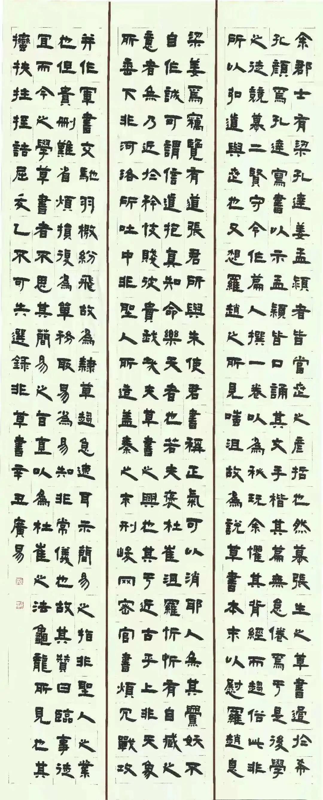 时光荏苒,岁月流走,蓦然回首学书之路已有八个春秋。2013年初学楷书,期间篆隶行草皆有临摹,因痴迷于汉隶静穆中不失洒脱,端庄中仍有趣意,故主攻隶书,或是天性使然。在学习书法道路上并非毫无波澜,偶有困扰便潜心向恩师请教,每次受教都有拨云见日之感。当然,学书不仅方法对,有良师引路,还应多下功夫,打牢个人根基,便会功到自然成。就如欧阳修《试笔》中所说 :“作字要熟,熟则神气完实而有馀,与静坐中,自是一乐事”。