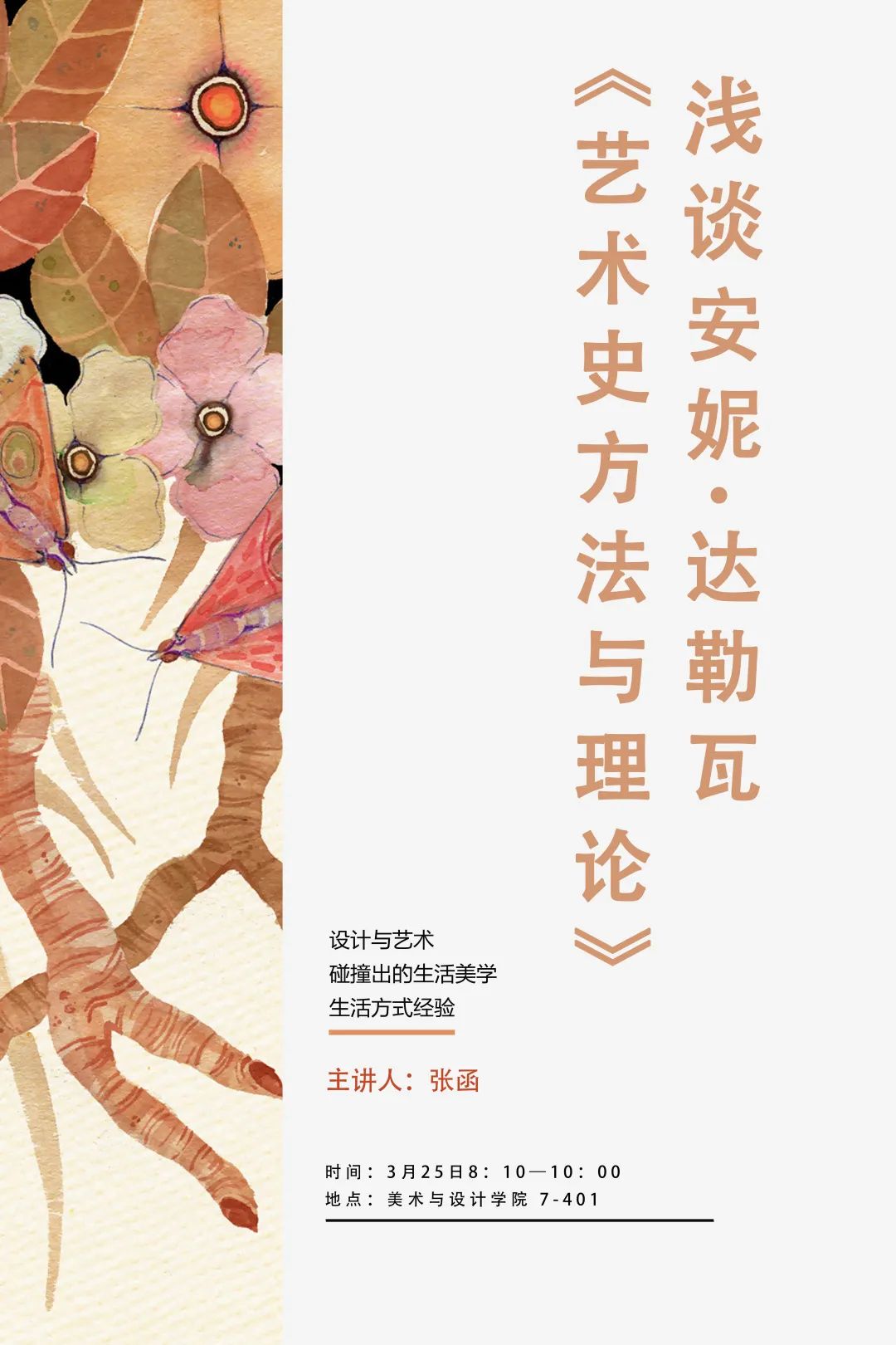 2022年3月25日上午在7号教学楼401教室,四虎 张函老师为2021级全体研究生做题为《浅谈安妮·达勒瓦〈艺术史方法与理论〉》的讲座。