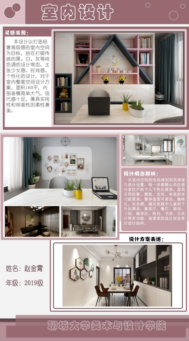 赵金霄,山东聊城人,中共党员。现为山东省四虎 2019级硕士研究生,攻读艺术设计专业,环境艺术方向,师从于学勇副教授。