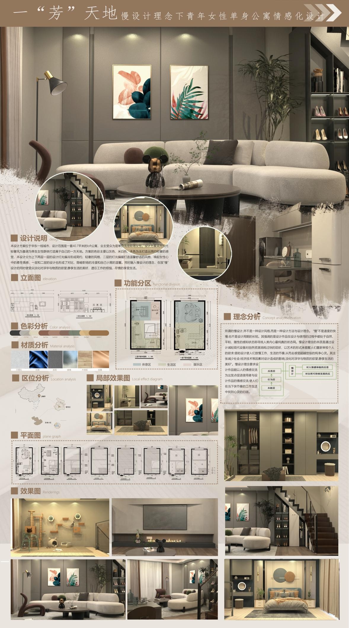 2023年11月作品《一“芳”天地——慢设计理念下青年女性单身公寓情感化设计》荣获第九届“中装杯”全国大学生环境设计大赛二等奖;