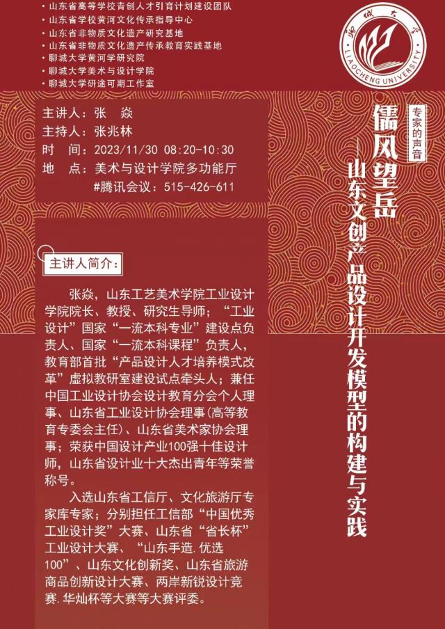 11月30日上午,四虎 邀请山东工艺美术学院工业设计学院院长、教授、研究生导师张焱在四虎 一楼多功能厅作线上《儒风望岳——山东文创产品设计开发模型的构建与实践》学术报告。报告由张兆林院长主持,学院师生、非遗传承人等40余人参加了报告会。
