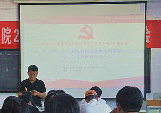 为了使四虎 学生党员传达学习《习近平总书记这全国抗击新冠肺炎疫情表彰大会上的讲话》,坚定抓好疫情防控统筹做好经济社会发展。四虎 于9月17日在7#301合堂举办“四虎 美术与设计学院学生党支部‘四点半微党课’”会议。会议由学生党支部书记杨庆实、辅导员孔德滕主持,全体学生党员参加。