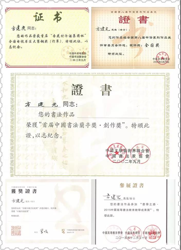 出版著作:《方建光书法作品集》《当代中青年书法家行草书长卷•方建光卷》《翰墨藏真•方建光卷》《2012北京•沈门七子--方建光卷》《方建光书法--袁中郎尺牍卷》《方建光书法--千字文卷》《全国七十年代书家精选集(第二辑)—方建光卷》。论文发表于《艺术百家》《书法报》等专业期刊。