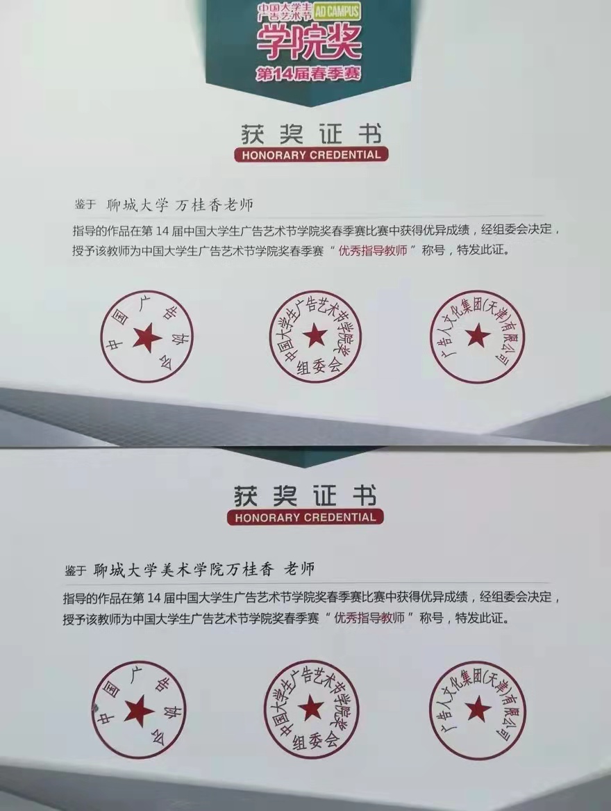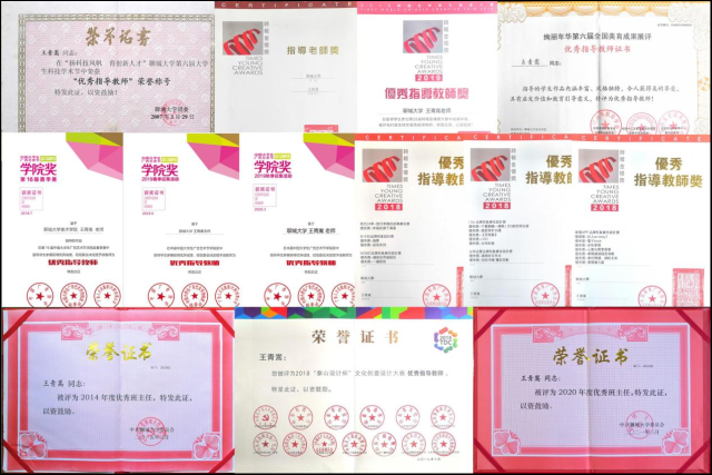 指导学生参加由中国高等教育学会、中国广告协会等单位主办的全国大学生广告艺术大赛、中国大学生广告艺术节学院奖、金犊奖等重要专业设计大赛,所指导的学生获得各级奖项150余项,个人荣获“优秀指导教师”荣誉称号十余项,并两次获得四虎 优秀班主任荣誉称号。
