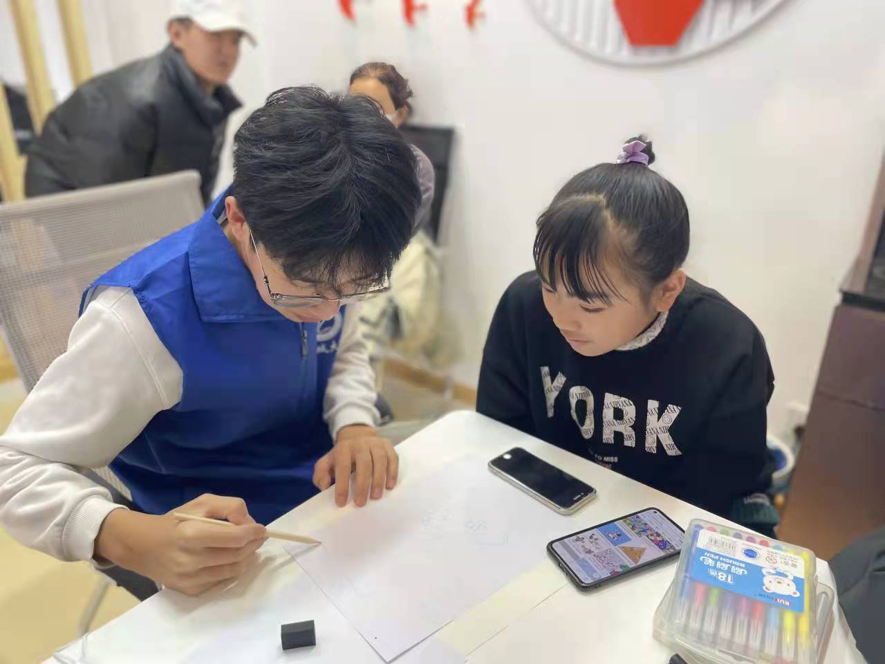 活动分为两部分,以小课堂形式进行。志愿者首先结合PPT生动形象地向小朋友们讲述了新中国的发展历程和中华人民共和国成立后发生的重大历史事件,让小朋友们了解我国艰辛历程与辉煌岁月。在提问时,小朋友们积极举手回答志愿者的问题。为加强小朋友们对其掌握程度,志愿者给小朋友们播放了关于新中国发展的视频,使孩子们对新中国的发展过程印象更加深刻。随后,活动第二部分,志愿者同小朋友进行有关新中国红色历程绘画练习,并一对一辅导,在画画同时,志愿者边画边讲述着所绘内容,为小朋友们普及更多相关知识,以便对创作内容更深层了解。志愿者在小朋友们的想法上加以辅助,使得一幅幅美丽的图画呈现在面前。下课后,小朋友们举着自己的画跟志愿者们合影留念。