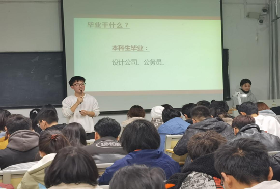 张老师首先通过问卷调查的形式,向学生提出了一系列就业问题,如毕业去向如何选择、从事何种行业的工作、是否进行过职业规划,进一步引发其对自身就业方向的思考。接着,围绕设计学的学科特色展开讲解,通过播放视频PPT及图片的方式,让学生更加直观深入的熟悉设计学专业知识、学科前景和发展优劣势。最后,根据今年的考研形势,对考研英语知识及专业技能测试做了充分的讲解,期间,张老师现场绘制了一幅专业技能测试作品,实操和讲解同步进行,使同学们对创作时的用笔技巧与方法理解得更加充分。