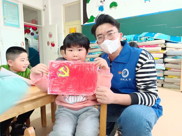 党旗飘飘听着歌声成长,凝望红旗长大。负责人为小朋友们讲解党的历史和党旗的由来,小朋友们聚精会神的听讲,心中充满敬意。随后,负责人组织小朋友们分配小组,通过生动有趣的故事使小朋友们对党的理解更加深刻。期间,志愿者贴心的为小朋友们分发纸张,笔和油画棒等画画工具。小朋友们拿出五颜六色的彩笔对党旗进行涂色,尽情创造。志愿者们坐在小朋友们旁边给小朋友足够的创作空间并且加以引导。小朋友们神情专注,仔细的用彩笔画出党旗用手中的笔勾勒出对党的祝福。一节课的时间,每个小朋友的手上都呈现着一面面鲜艳的党旗,争先恐后的向老师和志愿者们展示自己的作品。活动接近尾声,志愿者与小朋友们合影以此纪念此次活动圆满结束。