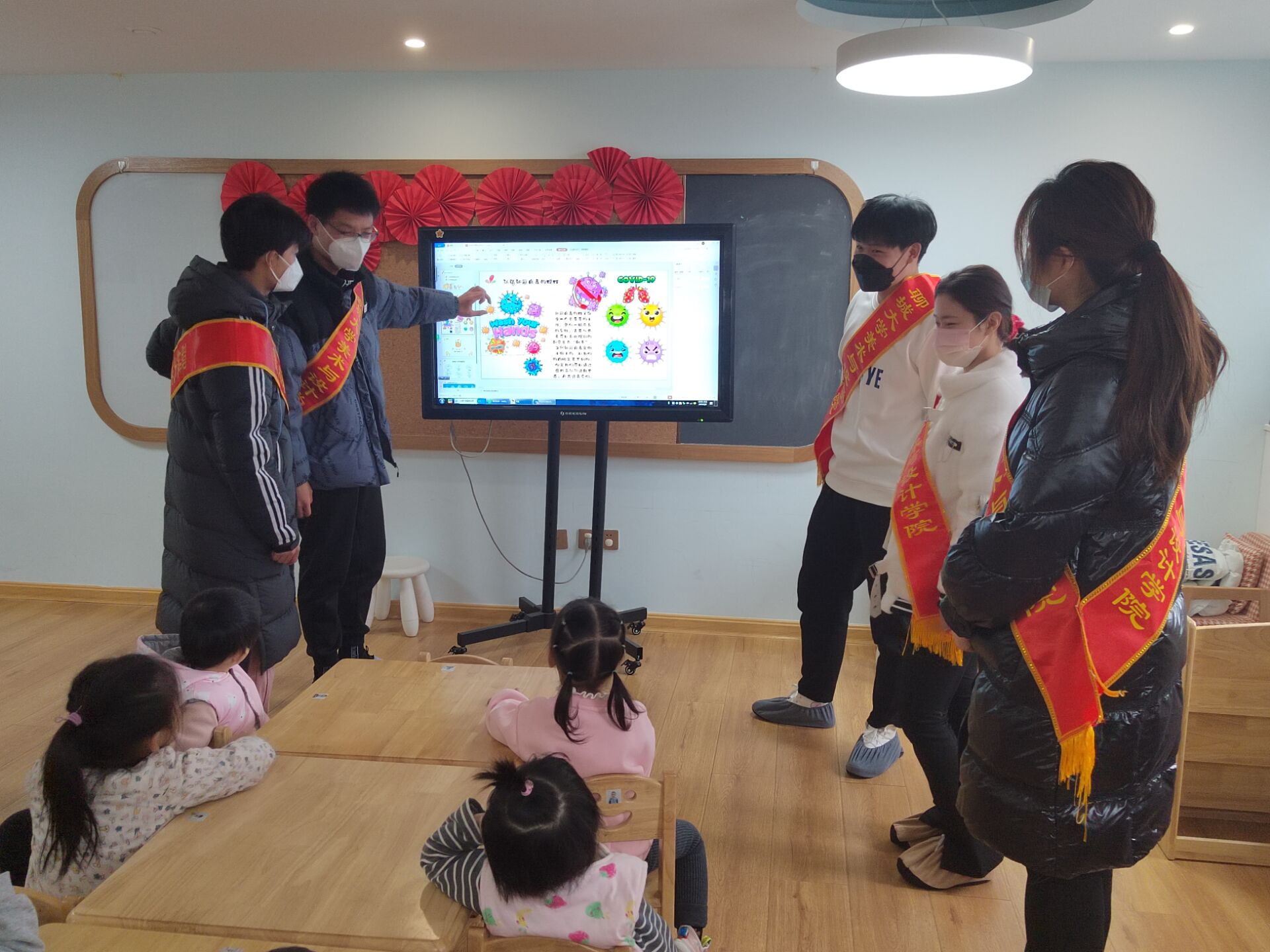 志愿者们事先通过网络找好一些防疫图标,了解图标的意义。活动之初,志愿者们通过电脑展示这些防疫图标并找学生们来解释它们的意义和内涵,加深学生们对防疫图标的认识。一起讨论新冠的常见表现、口罩的正确佩戴方法、卫生注意事项和感染的症状、新冠与普通感冒的区别等问题。减少外出,做到“非必要,不外出”减少与他人接触。出行尽量乘坐私家车,在乘坐公共交通工具时一定要全程配戴好口罩。出行在外要保持手部卫生,回家后要用流动的水洗手。在家中,勤开窗,常通风。除此之外,还要作息有规律,合理饮食,积极参加体育活动,增强抵抗力。给学生们讲了疫情大数据,宣传疫情防治知识,提高科学应对、有效防范的能力。