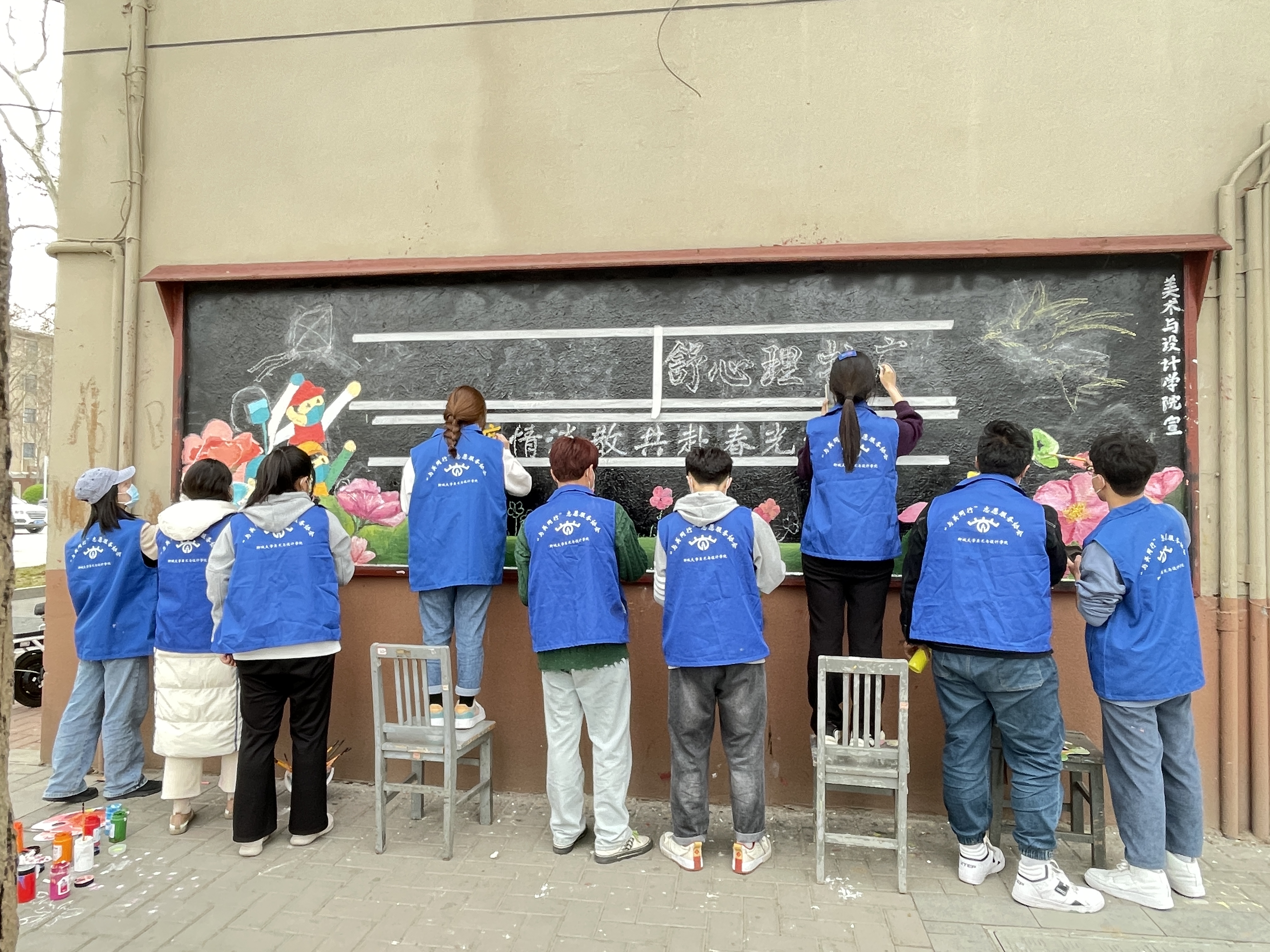 活动初期,志愿者们通过各种渠道搜集防控新冠肺炎疫情的资料,精心设计版面,在最终选定图案后来到活动现场,用彩色颜料书写下“共防治争模范,舒心理抗疫情”“待疫情消散,共赴春光无限”等鼓舞人心的句子,向大家传递出“不畏艰险永向前"的决心和战“疫"必胜的信心。板报中粉色的花朵、青色的草地围绕四周,成群结队的蝴蝶在花丛中翩翩起舞,给板报增添了几分生机;还有那身穿防护服高举手臂的抗疫小战士,生动形象。志愿者们利用黑板报这一宣传阵地,大力宣传疫情防控小知识,既向在抗疫前线的工作人员致敬,又宣传了防疫知识,有利于提高学生的防疫意识,进一步筑牢了维护学生健康安全的屏障。让同学们增强自我保护意识,提高疫情防护能力,人人争做疫情防控的小卫士,为早日打疫情防控阻击战而努力!