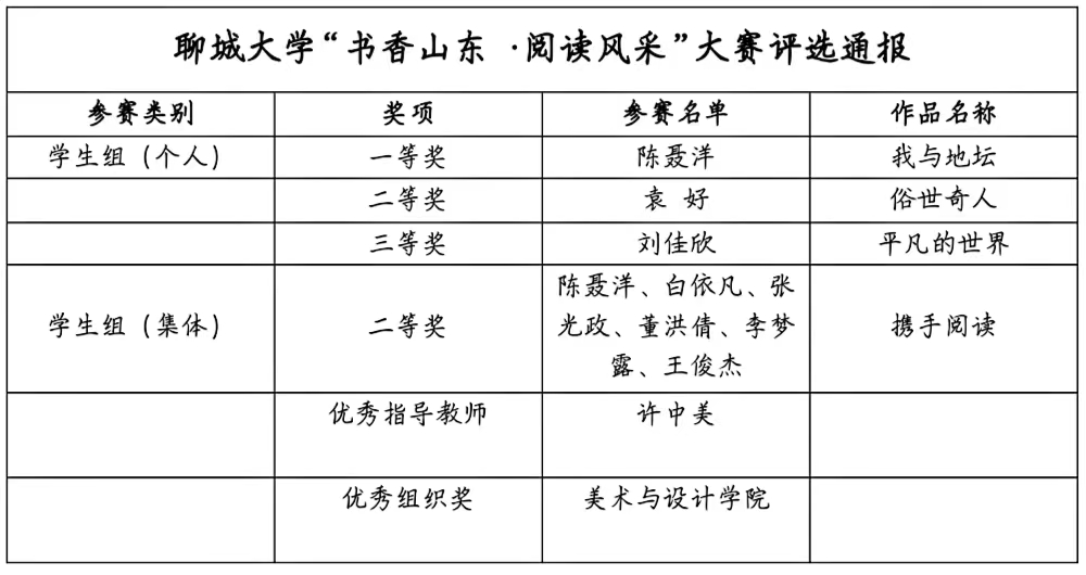 根据《中共山东省委宣传部、山东省教育厅关于印发山东省高校师生“阅读新时代·书香润校园”阅读活动方案的通知》《四虎 学生“书香山东·阅读风采”大赛实施方案》《四虎 “书香山东·读书征文”大赛实施方案》要求,学院高度重视,精心准备,经学院初选、学校专家评审小组评审,四虎 获得学生组一等奖1项,二等奖2项,三等奖2项,集体奖1项,并获得优秀组织奖。其中“书香山东·阅读风采”大赛学生组一等奖作品“我与地坛”被推荐省级选拔。