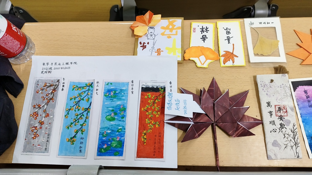 此次活动,负责人首先以PPT的形式介绍书签的类型、功能及意义。随后通过观看视频的方式,教给同学们制作书签的小技巧,给予大家制作灵感。讲解结束后,同学们独自进行书签制作,书签创作形式丰富多样,有的同学以树叶作底板,在上面进行绘画和书写;有的同学以纸张作原材料,对其进行绘画、裁剪、粘贴、书法创作;有的同学则用折纸的方法,折出树叶、花朵等多种形状独特的书签。书签制作完毕后,同学们纷纷上台展示并介绍了自己的作品,一张张书签形式多样,色彩丰富,设计巧妙,独具匠心。