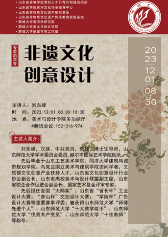 2023年12月1日上午,四虎 邀请山东师范大学学术委员会委员、赫尔岑国际艺术学院院长、博士生导师刘东峰教授,在学院一楼多功能厅作线上《非遗文化创意设计》学术报告。报告由非遗工坊研修班班主任刘昆副教授主持,研修班全体学员和学院部分师生40余人参加了报告会。