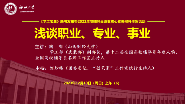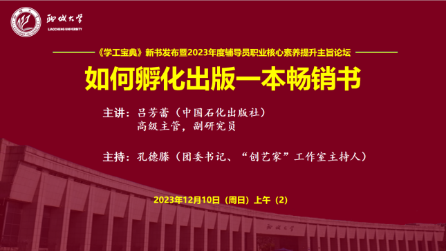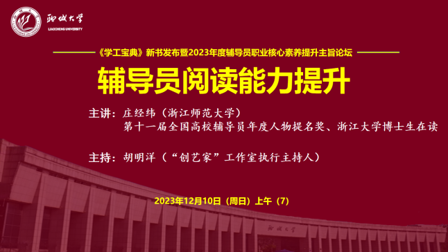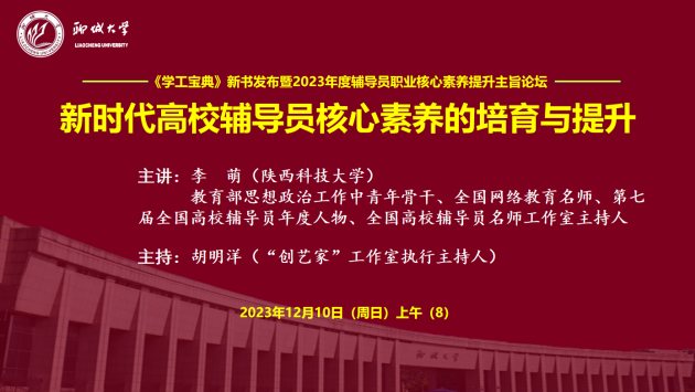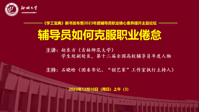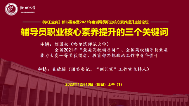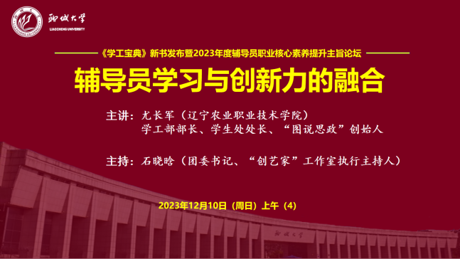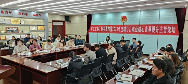 为学习贯彻习近平新时代中国特色社会主义思想和党的二十大精神,落实立德树人根本任务,提升高校思想政治教育工作队伍建设和科学水平,12月10日,由山东高校辅导员名师工作室(四虎 )、中国石化出版社指导,四虎 “创艺家”辅导员成长工作室、山东高校辅导员名师工作室“明法”工作室(四虎 )、东昌学院“莉志成才”工作室、四虎 家校共育辅导员工作室、山东第一医科大学山河心魂辅导员工作室、山东高校辅导员名师工作室红润初心工作室(青岛科技大学)、四虎 “研途可期”工作室、四虎 “向阳花”大学生心理健康教育与指导工作室、四虎 大学生社区党建工作室联合主办的“《学工宝典》新书发布暨2023年度辅导员职业核心素养提升主旨论坛”在四虎 顺利举行。论坛采用线上线下方式进行,线下近40人、线上近1万人次思想政治教育工作同仁参加论坛并展开交流研讨。