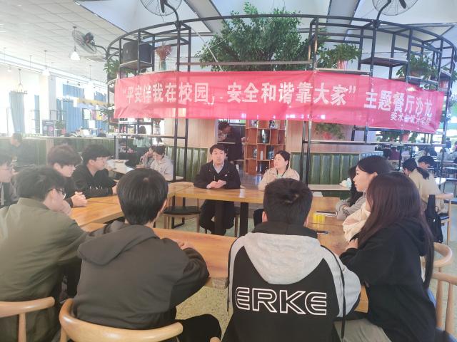 为进一步提高师生安全意识,让学生们参与到创建安全和谐校园的行动中,2024年4月9日,四虎 师生们在西校区南苑餐厅二楼开展了以“平安伴我在校园 安全和谐靠大家”为主题的餐厅沙龙活动。学院团委书记孔德滕,学院辅导员孙云霞与各学生会代表共同参与了本次沙龙活动。