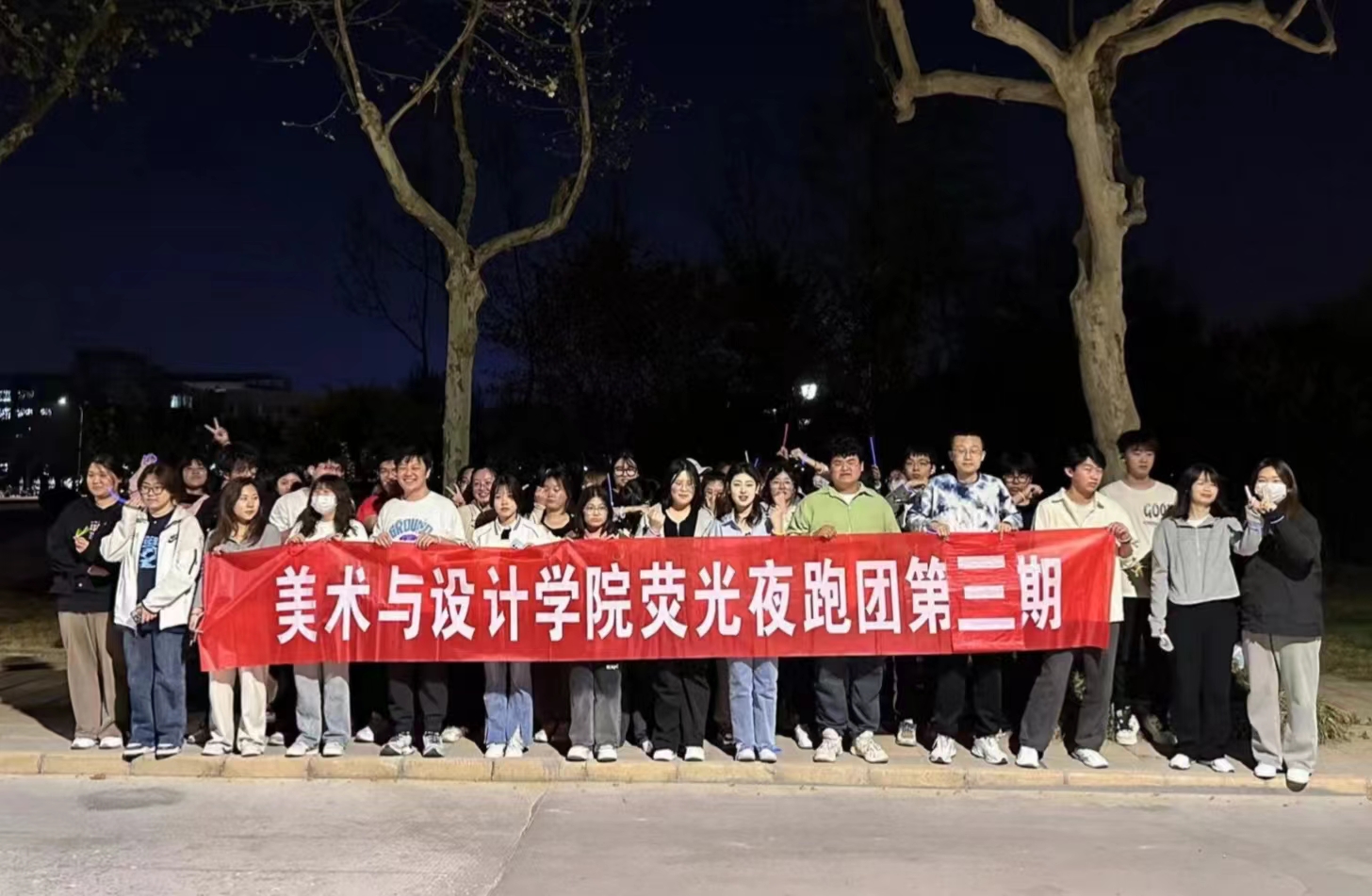 活动开始前,师生在四虎 门前集合,并由负责人带领同学们进行准备活动。在黑夜下昏黄的灯光中,随着一根根荧光手环的亮起,点缀着黑夜,师生手拿荧光棒和手环,队列整齐划一,跑步过程中同学们的步伐也铿锵有力,充满热情。