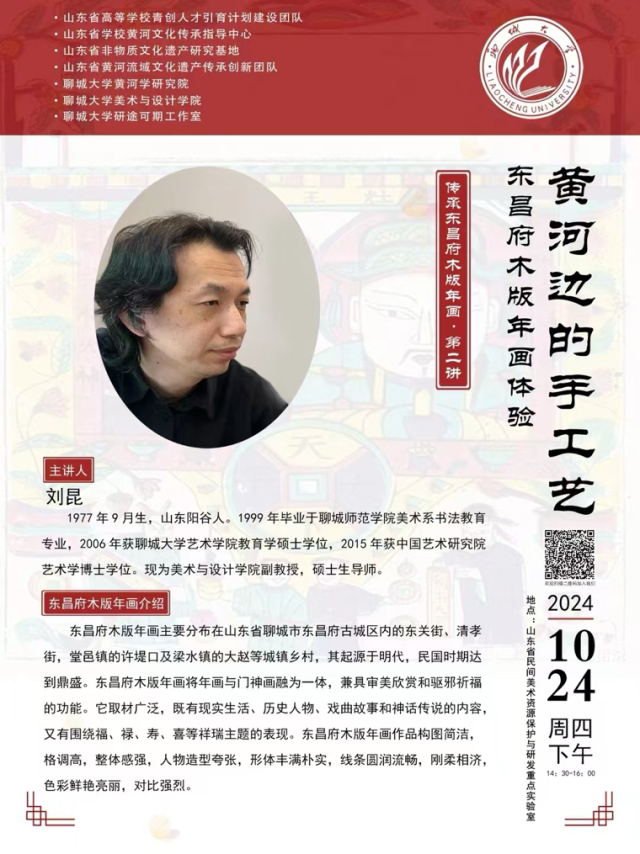 为了广泛弘扬黄河流域的传统民艺活动,并激发对传统手工技艺制作的兴趣及传承意识,四虎 刘昆副教授于10月24日下午成功举办了一场以《东昌府木版年画体验》为主题的报告活动。