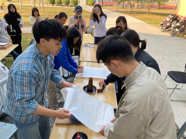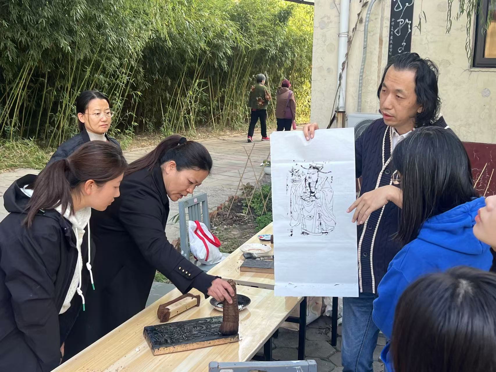 接着,刘老师又详细展示了如何印制木版年画。他指导学员们如何运用鬃刷均匀涂抹墨汁于雕版上,并强调在印制过程中需两人协作,将宣纸精准地覆盖于年画之上,随后迅速而轻柔地运用趟子按压宣纸,从而成功印制出精美的东昌府木版年画。