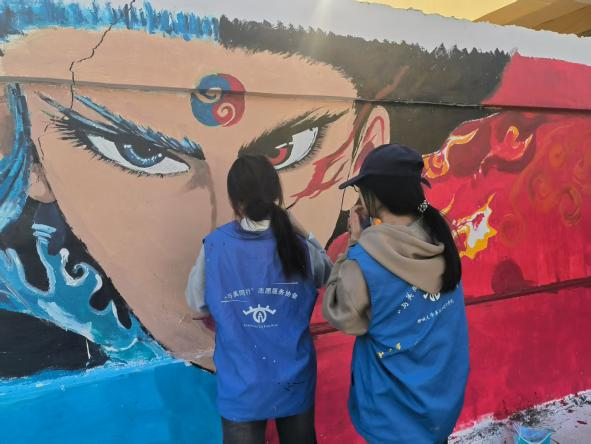 经过为期四天的创作,志愿者们通过调色、打稿、描线、上色各环节有序衔接,以专业技法在斑驳墙面上描绘乡村振兴图景。现代农业产业园、数字化种植基地等画面展现着农业现代化的美好蓝图,而近8米的哪吒闹海主题墙绘则以飞扬灵动的笔触,塑造出兼具童真与英武的传统文化形象——少年英雄目光如炬,衣袂翩跹,在云纹海浪间尽显文化自信。