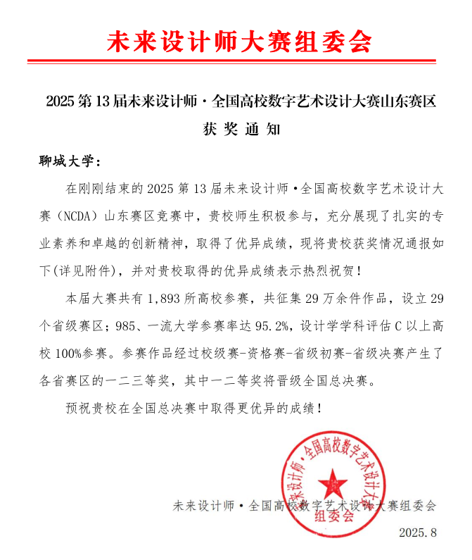 据悉,未来设计师·全国高校数字艺术设计大赛(NCDA)是入选《全国普通高校学科竞赛排行榜》的权威赛事,大赛包括“大学生竞赛 NCDA”、“教师竞赛 NDTC”、“国际赛 IIDA”、艺术设计作品展,构建了“校赛-省赛-国赛-国际赛”的竞赛链。大赛秉承“设计为人民服务,培养未来设计师”的理念,倡导可持续发展、绿色低碳设计,传承红色文化,助力乡村振兴,鼓励大学生用专业知识服务社会,拓宽国际视野。本届大赛共吸引1893所高校参与,征集作品超过29万件,设立了29个省级赛区。其中,985、一流大学参赛率高达95.2%,设计学学科评估C以上高校全部参赛。