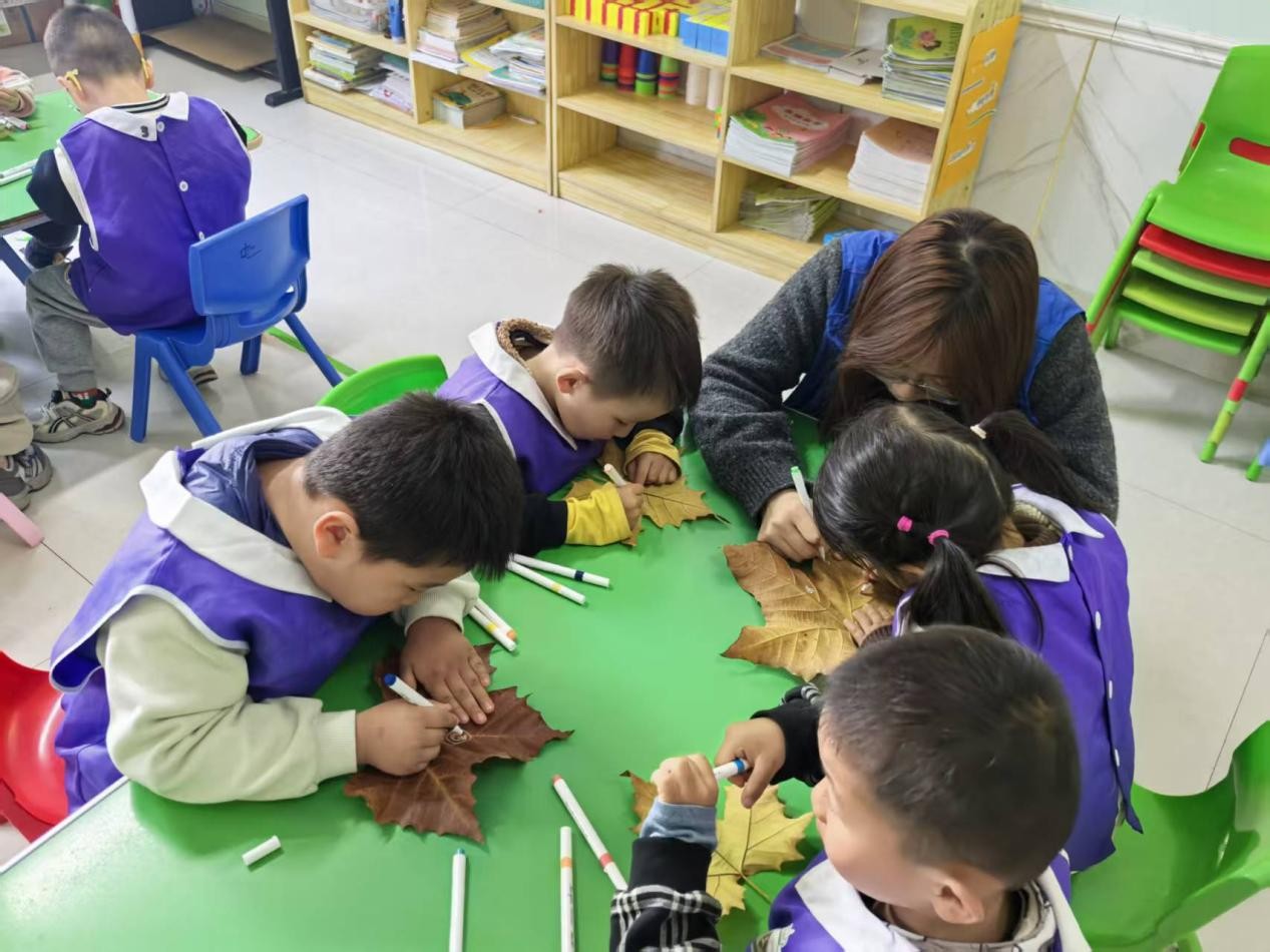活动前期,志愿者精心筹备木叶画材料、研习绘制技巧并明确教学、摄影、后勤分工。活动伊始,志愿者引导幼儿有序领取材料后,以“叶上绘童话”开场,简要讲解商丘木叶画历史与创作方法,随即一对一开展协助:手把手调整握笔姿势,提供花鸟、卡通等创意灵感。孩子们在银杏叶上勾勒灵动图案,沉浸式体验非遗与自然碰撞的美感,很快,银杏叶上渐渐铺满灵动的图案,孩子们举着成品左看右看,眼里都漾开了笑意。最后,大家捧着叶上的“童话”合影,暖黄色的叶片衬着一张张笑脸,把非遗的趣味悄悄藏进了秋日时光里。