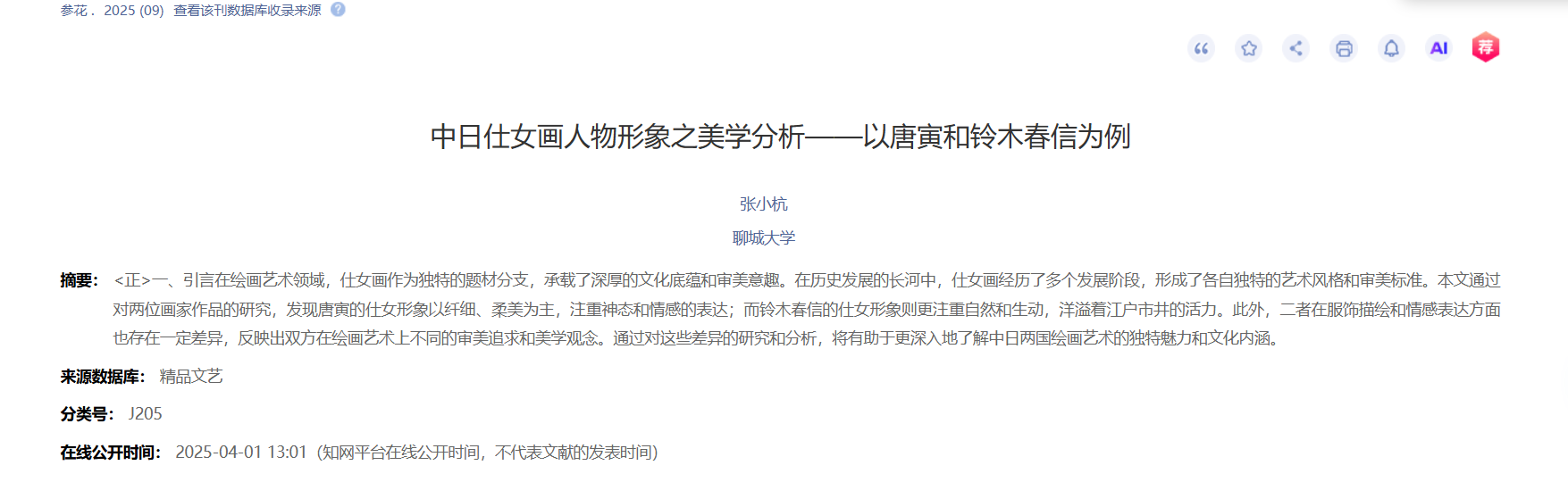 2025年3月论文《中日仕女画人物形象之美学分析——以唐寅和铃木春信为例》。