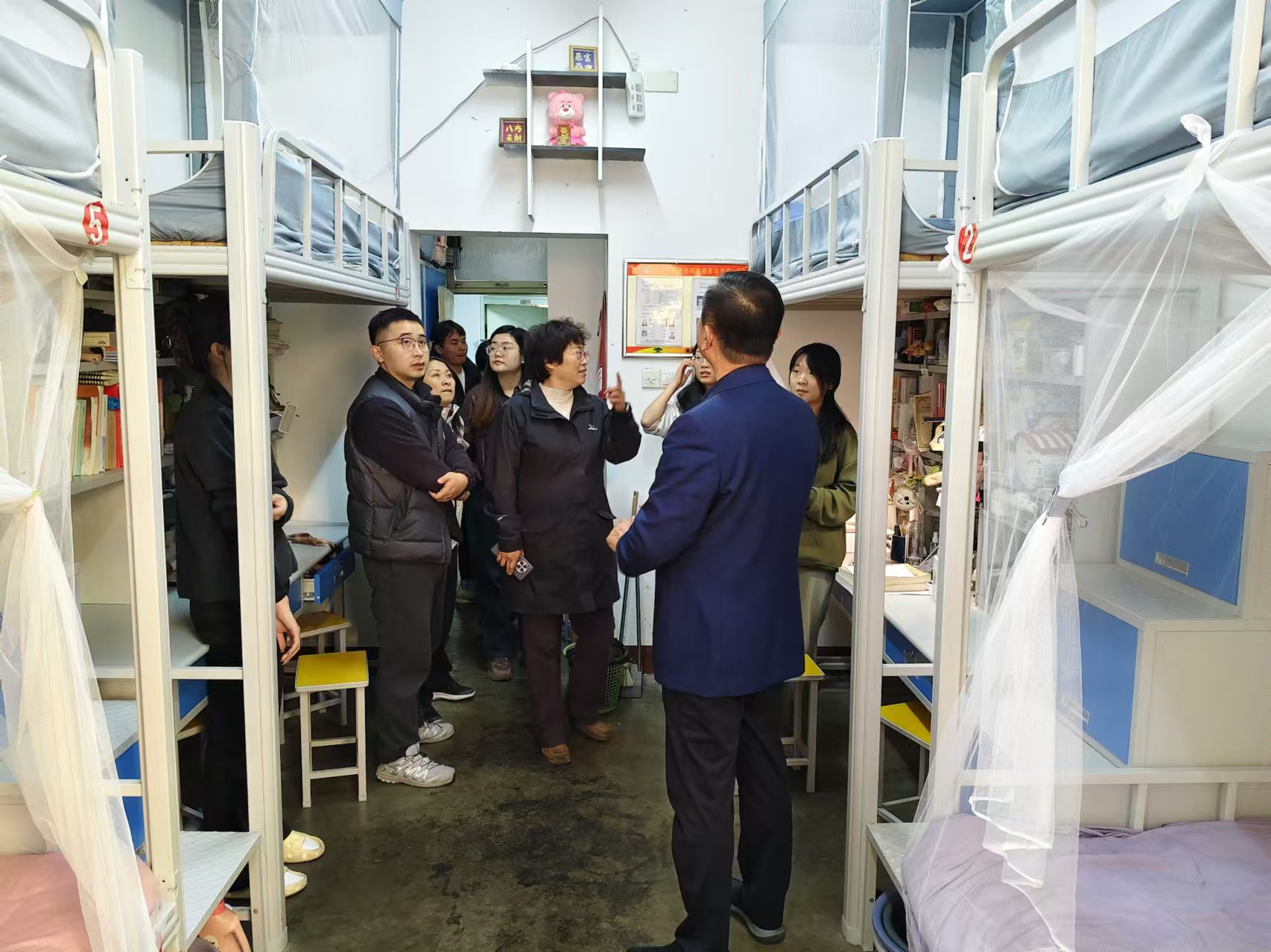 在走访过程中,学院领导着重强调了宿舍消防安全问题,提醒同学们要遵守宿舍管理规定,不使用违规电器、不私拉乱接电线,保持宿舍安全通道畅通;同时叮嘱同学们要注意个人财产安全,妥善保管好自己的贵重物品。随后,在走访过程中,领导老师还提醒同学们要培养良好作息规律,加强自我管理,合理规划学习时间,培养健康文明,积极向上的生活习惯。最后,提醒同学们彼此之间多交流沟通,舍友之间团结友爱,鼓励同学们养成良好的个人卫生习惯,提高宿舍环境质量,让学习和生活空间更加清爽明亮。