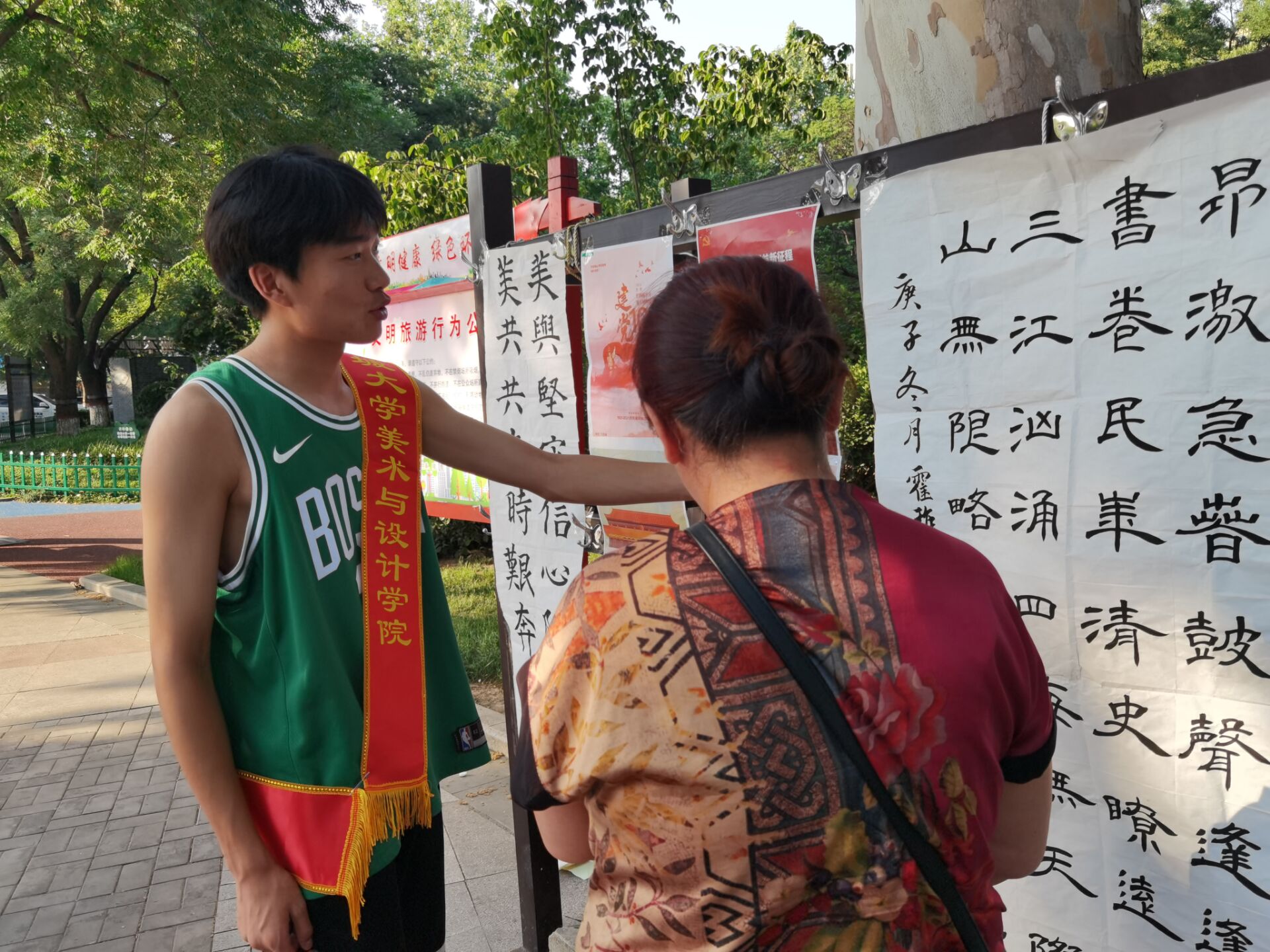 静水流深,见证世事沧桑。活动开始之前,志愿者们准备好自己制作的与党史有关的书法、国画、海报等作品,在人民公园进行展览,通过党史作品的展览,以形式多样的书法种类展览,展现中华文化魅力和时代风采。以自身的专业优势书写党史故事。活动中,这些各种各样的书画作品吸引到很多市民前来参观,很多老人参观完都对此赞不绝口,并感叹现在人民的美好生活,志愿者们在其受益匪浅。