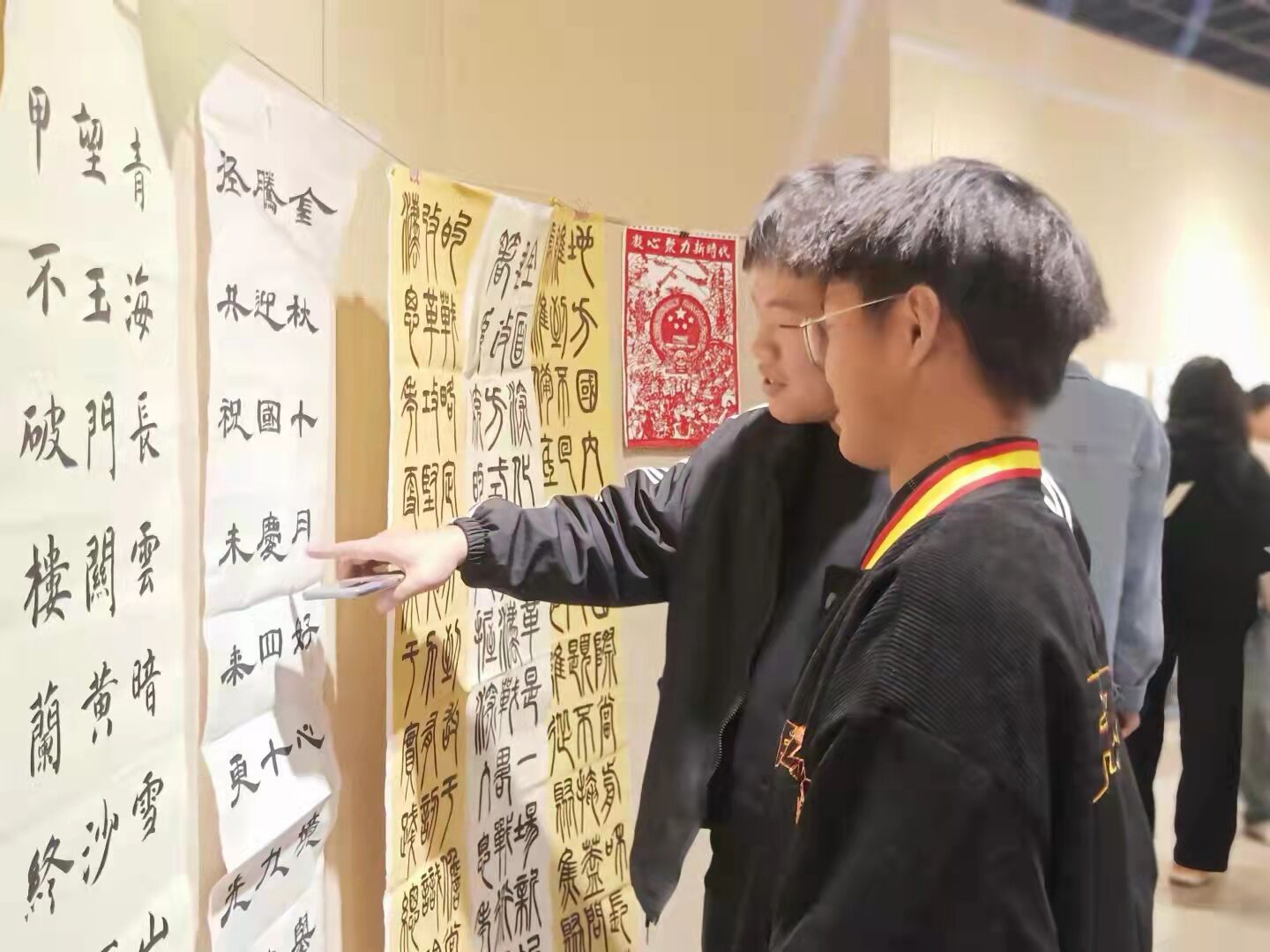 本次活动是向四虎 全部学生征集作品再向学生公开展览,目的为的是激发学生用本专业知识表达自己对祖国的尊敬。活动伊始,同学们准时到达展厅,组织人员有序调节会场秩序,以保证活动顺利开展,同时并下发纸质签到,确保参与人员名单。活动中,一幅幅形式多样、主题鲜明的剪纸、书法、绘画作品,充分展现了民间传统美术的艺术特点,它不仅是我国文化瑰宝,更是我国的宝贵遗存。这使参观的同学们不由得止住脚步,欣赏着墙上生动形象的作品,展厅内,同学们相互之间讨论作品,热情高涨,并纷纷拿出手机拍照留念。惟妙惟肖的剪纸、剑拔弩张的书法与形神兼备的绘画作品,都体现着同学们对国家的热爱与致敬。
