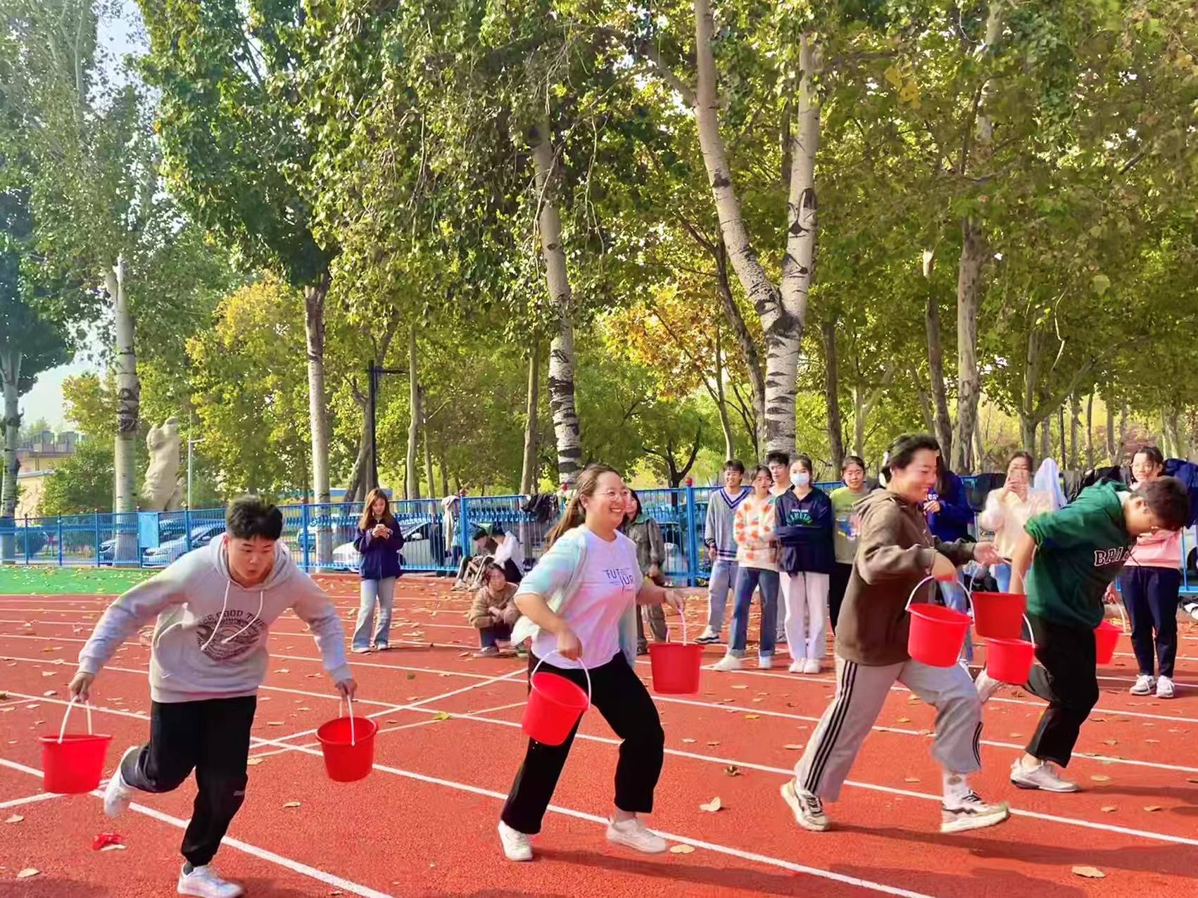 正是一年秋高气爽,本次趣味运动会在主持人的开幕词中拉开帷幕,比赛项目为一百米水桶接力赛、男女绑腿快走100米比赛和跳长绳比赛。运动员们跃跃欲试,以饱满的精神和认真的态度投入到比赛之中。伴随着“加油!加油!”的呐喊声,随着主持人的一声令下,迫不及待地冲了出去,接力比赛默契十足,通过两人三足的方式进行比赛,两人互帮互助,走向终点。最后是跳长绳比赛,男生摇绳,女生跳绳,也充分体现了男女同学之间的默契。运动员们在赛场上你追我赶,赛后一片欢腾,充分体现了“友谊第一,比赛第二”的体育精神。比赛时操场上一篇欢腾的景象,增进了同学们的默契和团队协作能力,让同学们更加体会到集体荣誉感操场上同学们踊跃展示风采,体现美院学子的精神风貌。