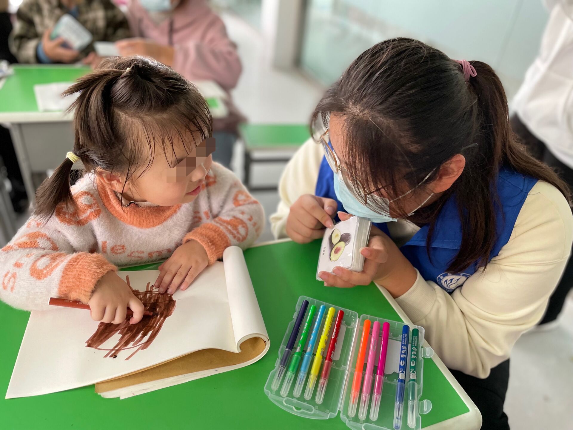 志愿者们提前准备好活动需要的水彩笔,画本,带有不同图案的小卡片等,穿戴好志愿者马甲,戴好口罩,进入康复中心后,提前进入教室摆好桌椅和绘画工具,做好活动前的准备。开始后,将带有不同形状的卡片打乱顺序,让孩子挑选自己喜欢的卡片,对卡片上的形状进行描述,并让孩子们列举出以前所学的家用电器、生活用品等与今天所学的哪些形状相一致。孩子们认真思考问题,志愿者们耐心陪伴的画面温馨而又美好。最后让孩子们用画笔将所学的形状画出来。绘画过程中,志愿者给予孩子们鼓励与赞美,提高孩子们的成就感与自信心。在志愿者和孩子们交流游戏的过程中,让志愿者们体会到了孩子们内心的那份天真和对于外界交流的渴望,而孩子们也都乐在其中,在画纸上大显身手。