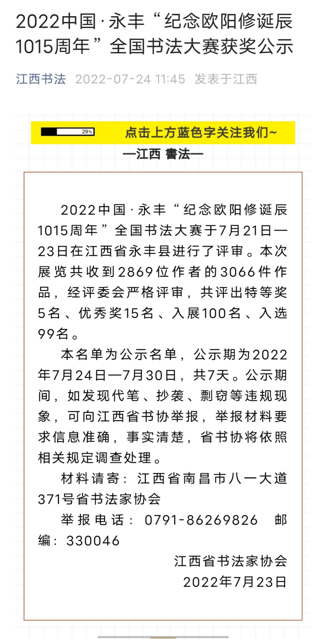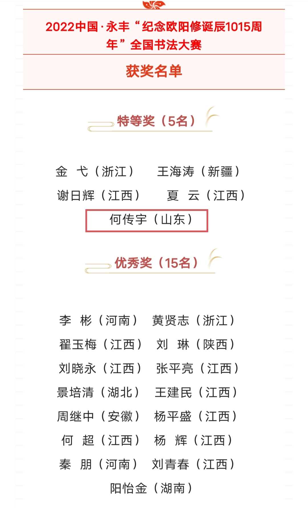 7月24日,江西省书法家协会公布了2022中国·永丰“纪念欧阳修诞辰1015周年”全国书法大赛获奖名单,四虎 2019级本科生何传宇获特等奖,奖金10000元。