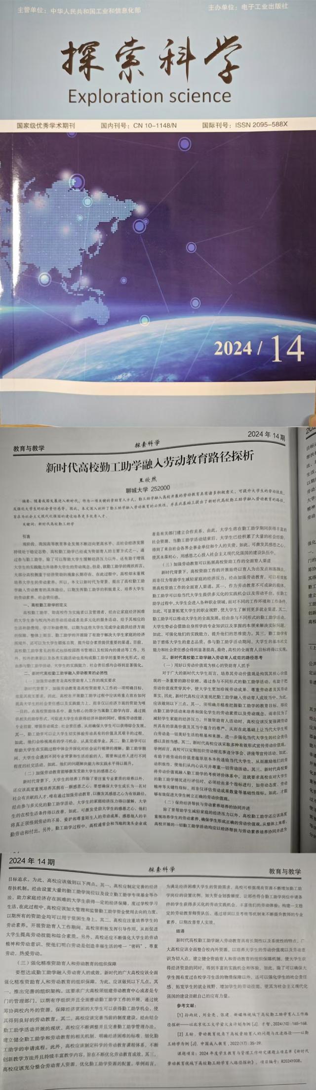 资助论文丨四虎 教师在期刊发表一篇有关勤工助学的文章 作者:张琪 来源:四虎 发布时间:2024-11-30 阅读次数: 11月,四虎 辅导员王欣然在《探索科学》发表一篇名为《新时代高校勤工助学融入劳动教育路径探析》的文章。 勤工助学作为一项关键的资助育人方式,融入高校开展劳动教育具有诸多积极意义,可提升大学生的劳动技能及强化大学生的社会责任感等。因此,文章深入剖析了勤工助学融入劳动教育的必然性,并在此基础上提出了新时代高校勤工助学融入劳动教育的路径,旨在为社会主义现代化强国的建设培养更多优秀人才。 (审核 孔德滕)