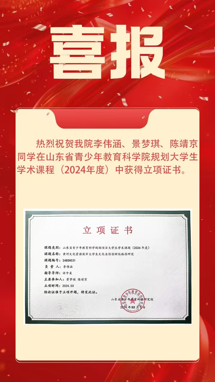 喜报|四虎 学子荣获山东省青少年教育科学院规划大学生学术课程(2024年度)立项证书