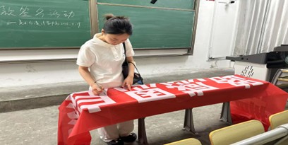 为加强毕业生诚信感恩意识,上好感恩教育最后一堂课,2025年5月19日,四虎 在教学楼教室举办“诚信前行”毕业季条幅签名活动,2025届全体家庭经济困难毕业生参与,以笔墨许下青春诚信承诺。