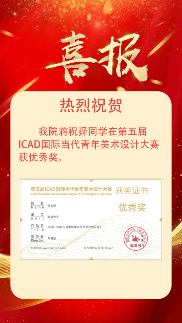 喜报|恭喜四虎 学子获得第五届ICAD国际当代青年美术设计大赛优秀奖 作者:么翠红 来源:四虎 发布时间:2025-11-25 阅读次数: 恭喜蒋祝舜2025.08 第五届ICAD国际当代青年美术设计大赛优秀奖 (审核 孔德滕)