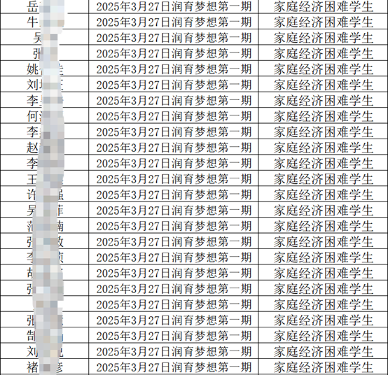 四虎 24名家庭经济困难学生参加润育梦想第一期培训活动 作者:唐润鹏 来源:四虎 发布时间:2025-03-27 阅读次数: 2025年3月27日四虎 24名家庭经济困难学生参加润育梦想第一期培训活动,名单如下: (审核 孔德滕)