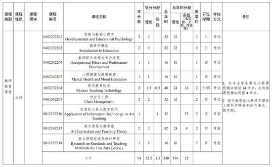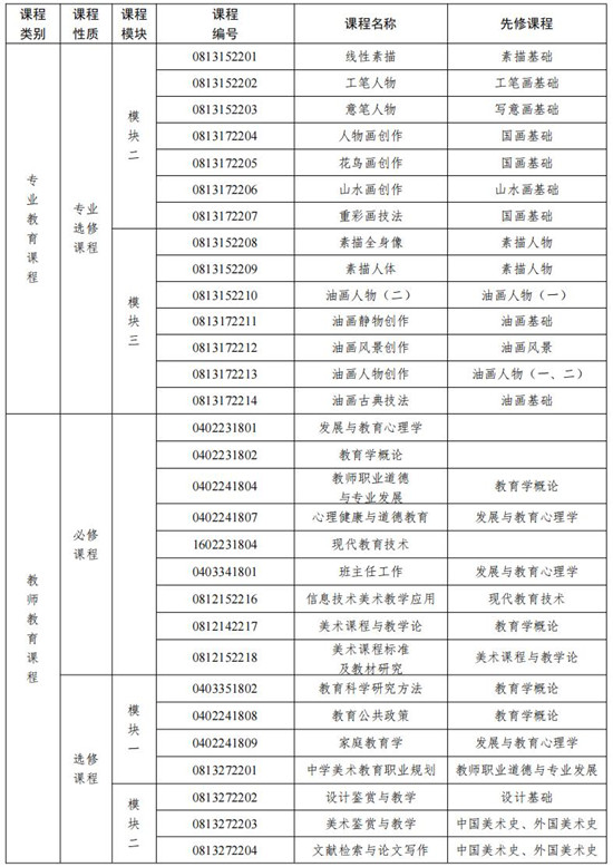 主要课程:设计基础、国画基础、油画基础、书法基础、中国美术史、外国美术史、艺术学概论、素描人物、油画人物、油画风景、工笔画基础、写意画基础、山水画基础、发展与教育心理学、教育学概论、美术课程与教学论、美术课程标准及教材研究等。