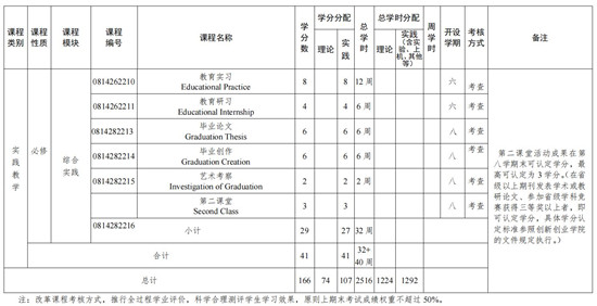本专业标准学制为四年,学校实行学分制下的弹性学制。计划总学时为 2516 学时、实践教学40 周,总学分为 166 学分。允许学生在 3~8 内修完规定课程,修满规定学分,准予毕业。符合学位授予条件者,经校学位委员会审核通过,可授予艺术学学士学位。