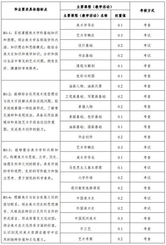 B1-1:系统掌握美术学科基础知识和原理,领会美术学各领域学科内涵、知识理论和思维模式;能结合美术史知识和美学知识,分析和探讨生活中常见的艺术问题,拥有良好、健康的审美修养;