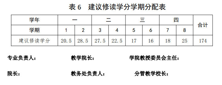 6. 表 6 为本专业本科生建议修读学分学期分配表
