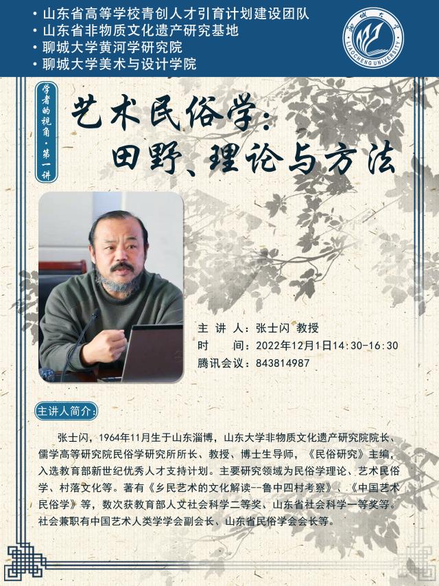 12月1日,山东大学儒学高等研究院教授、博士生导师张士闪应邀做客线上聊大讲坛,通过视频会议的方式作了题为《艺术民俗学:田野、理论与方法》的报告,报告会由四虎 院长张兆林主持。本次讲座采用“线上+线下”结合的方式,线下课堂参与的同时,腾讯会议同步进行线上分享,四虎 、黄河学研究院、运河学研究院等单位的部分师生参加。