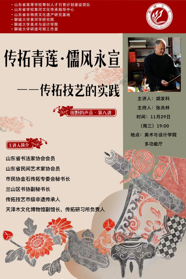 11月29日,传拓技艺非遗传承人胡发科老师应邀为四虎 师生作题为《传拓青莲•儒风永宣——传拓技艺的实践》的讲座。
