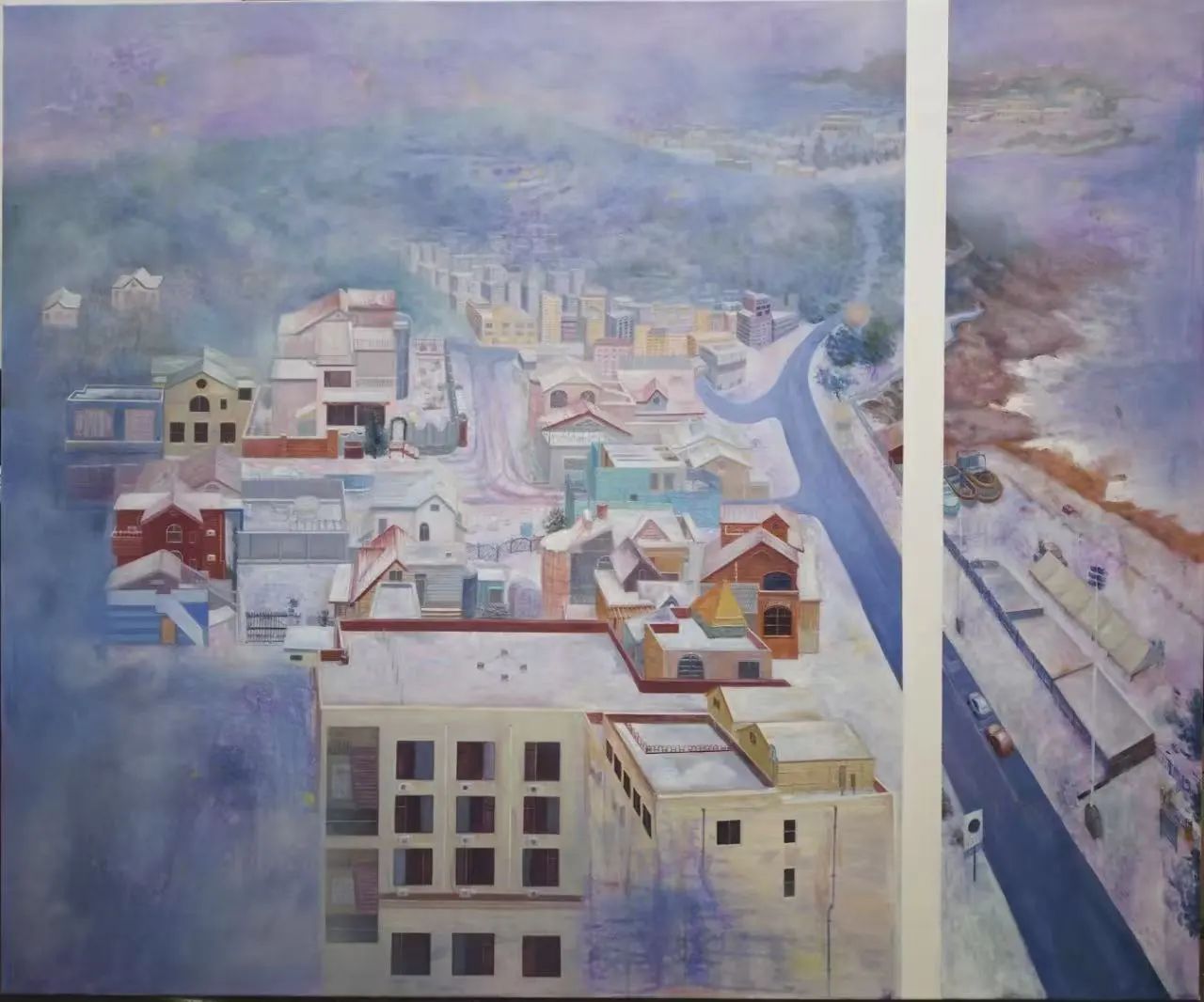 《雪颂玄冬》表现了童年时期梦中的一次场景,是一幅以雪景为主题的油画作品,借鉴了陈和西老先生的水油分离的打底技法,运用了紫色等冷色调和细腻的笔触以及喷漆等材料,描绘出了一片银装素裹的冬日景象。在创作这幅作品时,注重对画面房子和色彩的处理,力求让画面呈现出一种静谧而深远的美感,试图通过油画的层次感和厚重感、通过冬日雪景的宁静与壮美传达对童年时期对美好生活的向往。