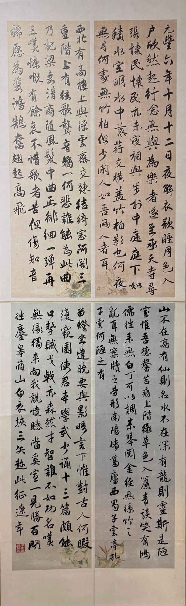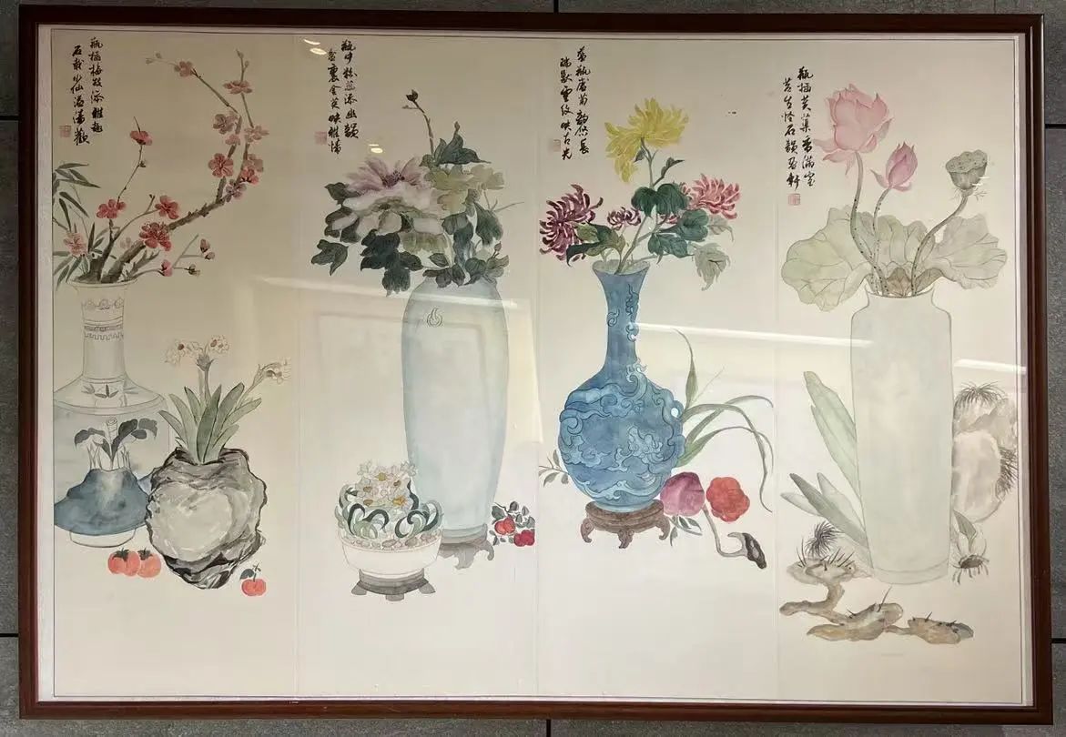 此幅作品属瓶花画类创作作品,以四联形式呈现,充满雅致韵味。画面中,形态各异的花瓶错落有致,分别插着梅花、牡丹、菊花、荷花等花卉,以细腻笔触勾勒花朵枝叶,设色清新淡雅又不失明艳,将花卉的娇艳与生机尽显纸上。瓶旁点缀的蔬果、草石等,丰富了画面层次,增添生活意趣。题字与画面相得益彰,不仅增添了文化气息,更借花卉传达出不同寓意,如梅花傲雪象征高洁,牡丹盛放寓意富贵等,整体营造出宁静而美好的艺术氛围。