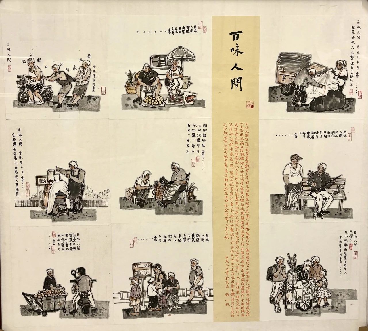 这幅作品名为《百味人间》,以水墨人物画的形式呈现。画面中,有街头奋力推车互助的路人、摆摊卖水果的商贩、专注理发的手艺人、悠闲拉二胡的老人等场景,充满了生活气息。作品聚焦平凡生活瞬间,展现出市井生活的多样与质朴,于烟火气中传递出人间百态,让观者感受到生活的真实与温度,也体现出创作者对平凡生活细致入微的观察与感悟。