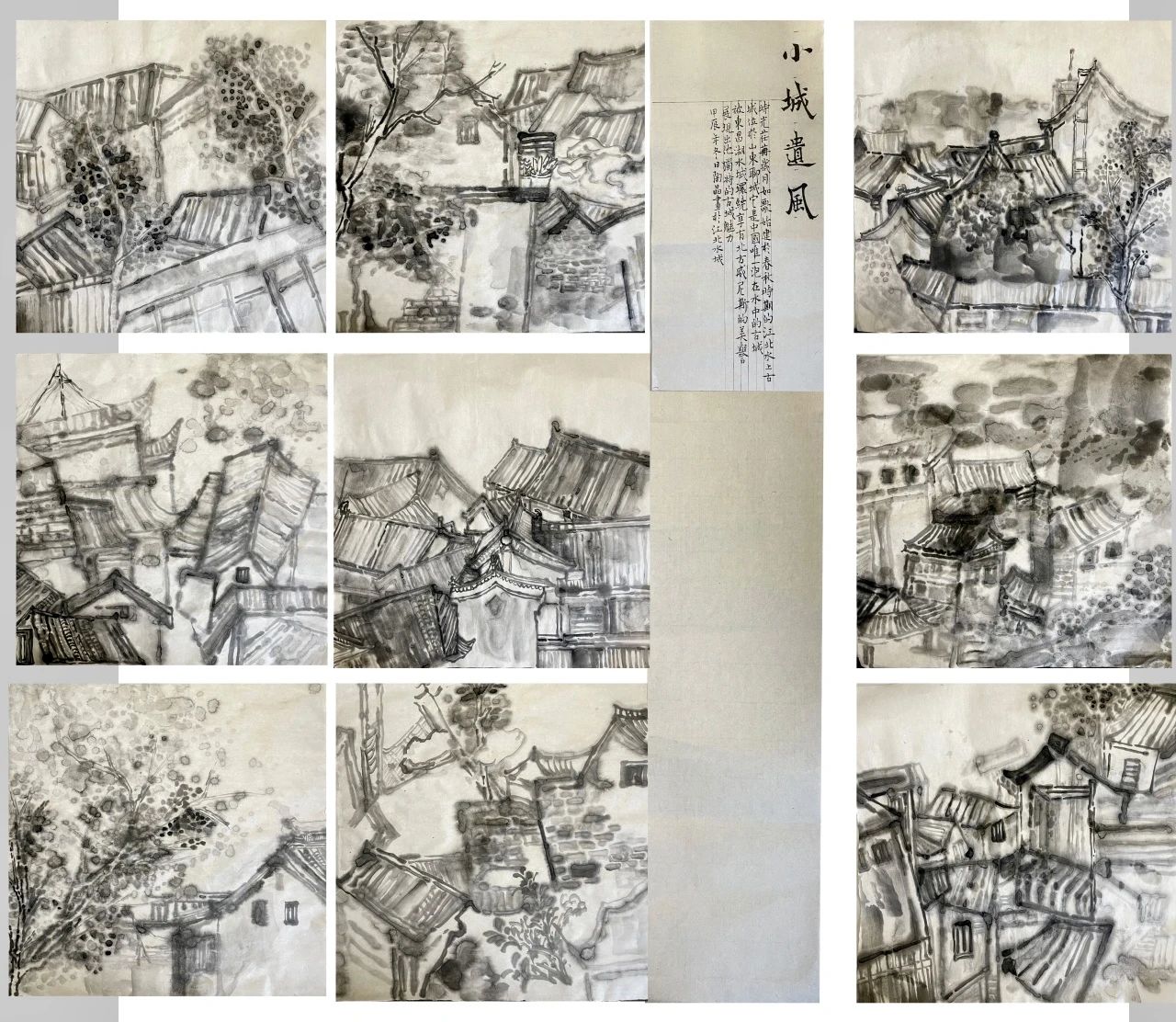 《小城遗风》是以聊城古楼建筑群为创作主体,采用宿墨技法创作的一幅国画山水作品。整幅作品向观者传达出水墨淋漓之感,将九幅小品以拼贴的形式组合,既增加了作品形式感与趣味性,又较为全面的展示出古城生活的丰富多彩。