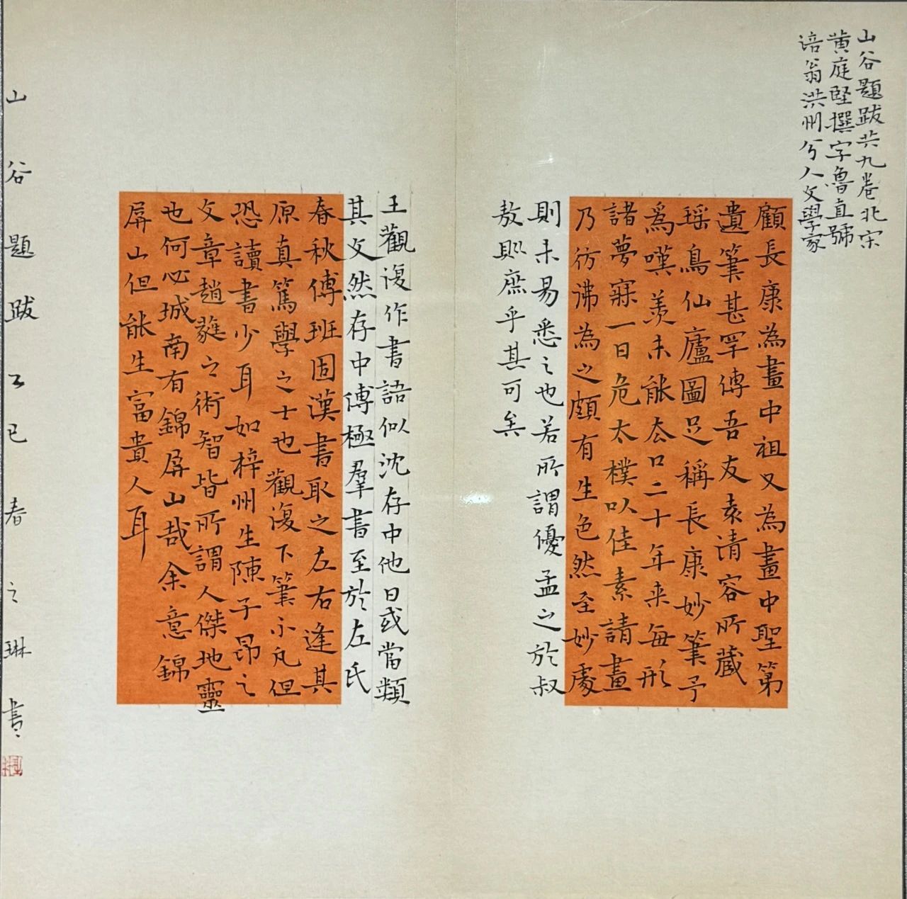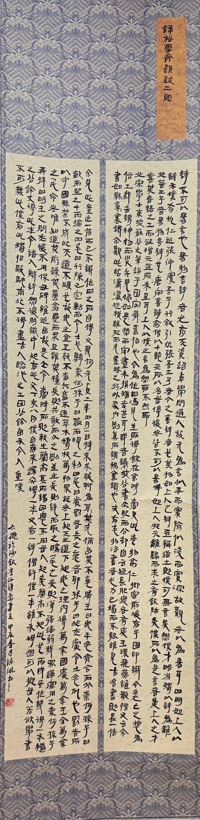 此作品是拟钟繇、宋儋笔意为创作风格,节录《山谷题跋》为创作内容的小楷作品。首先,在用笔方面,具有聚散含蓄的特点,在灵活多变的同时,也具有古拙的特点,在保证力度的前提下,用笔灵动多姿,使小楷在拙朴之外仍保留着灵动的趣味;其次,在章法方面,在空间上有舒朗通透的视觉感。字与字之间在相互呼应的同时,营造了空间上的留白;最后,在结字方面,体现了古拙的雅韵和浓厚的魏晋情怀。