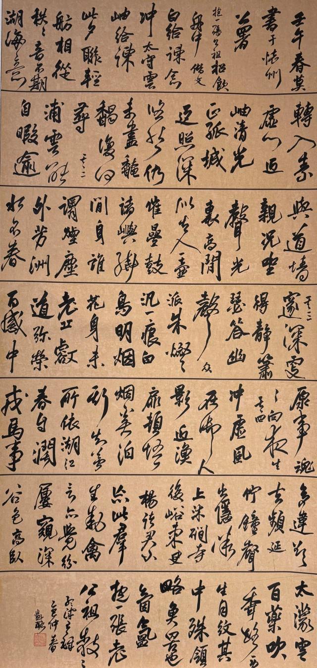 此幅作品从对临沂银雀山汉简的学习出发,在运笔上尽量贴近银雀山汉简《孙膑兵法》中的“月战”“势备”等带有草意书写意味的篇章,让笔画更轻盈,在体态上则掺入了些许秦简,让有些字形更古拙,章法上通过小字径、字距小、行距略大于字距来实现气息贯通的整体感。