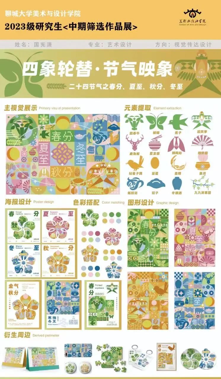 作品以春分、夏至、秋分、冬至四个节气为主题,将节气与象限相结合,采用圆形布局呼应节气轮回,四个节气分别占据圆形的四个象限。作品将传统节气文化与现代几何美学相结合,以简洁而富有创意的视觉形式展现二十四节气的魅力,同时深度融合节气对应的传统习俗,提取其元素符号,赋予作品丰富的文化内涵。